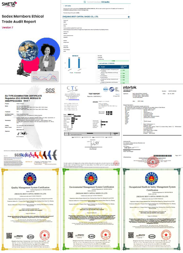公司通过SMETA验厂,ICS等社会责任验厂。产品通过EN 20345(欧洲)、ASTM F2413(美国)、CSA Z195(加拿大)、AS2210(澳大利亚)、Nch772(智利)和GB 21148(中国国家标准)
